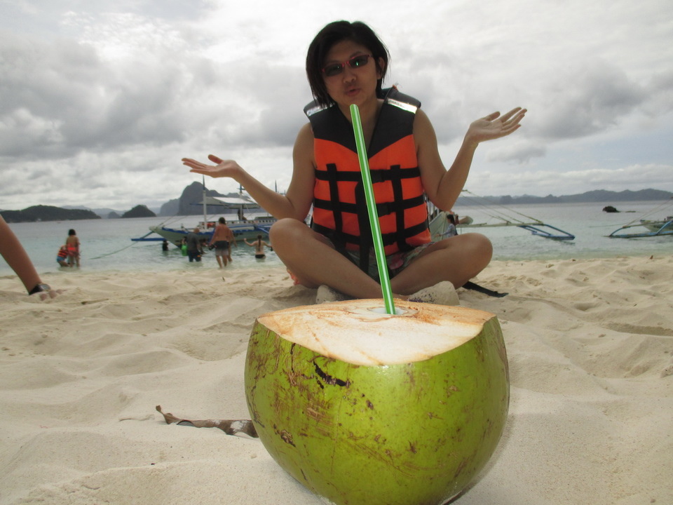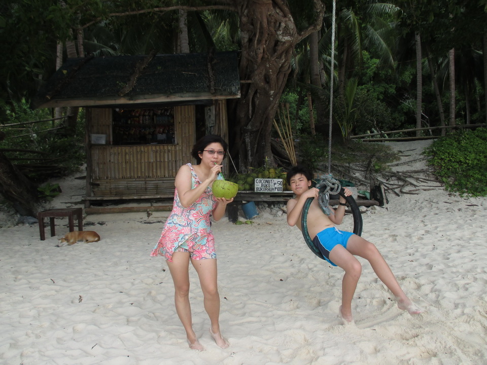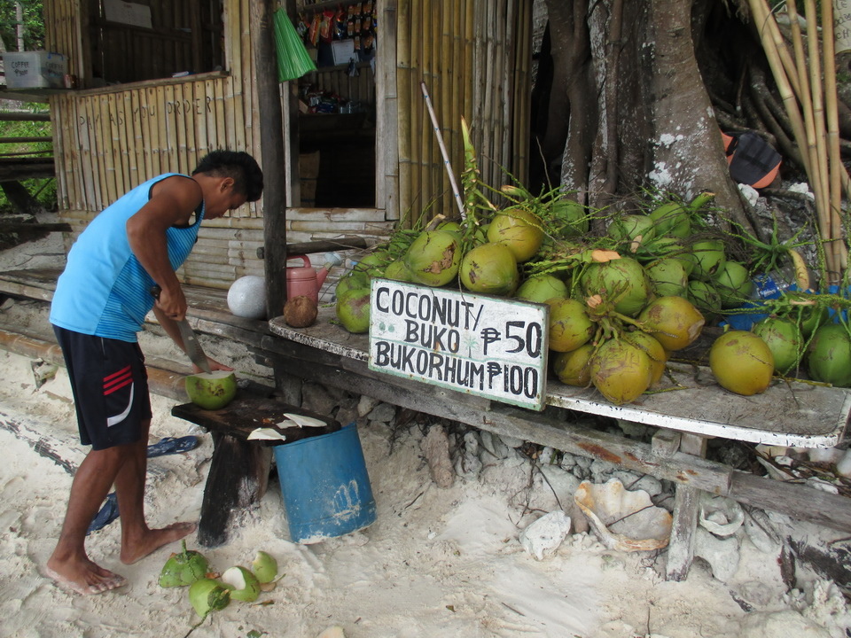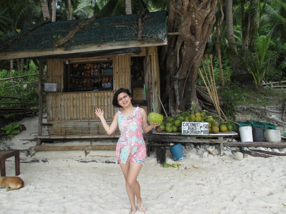 此海灘就在愛妮島小鎮的另一邊,所以沙灘上就有小竹屋在賣椰子及零食等,Buko 就是當地話椰子的意思,50p/粒,不算貴,所以jacky 就買了一顆!!