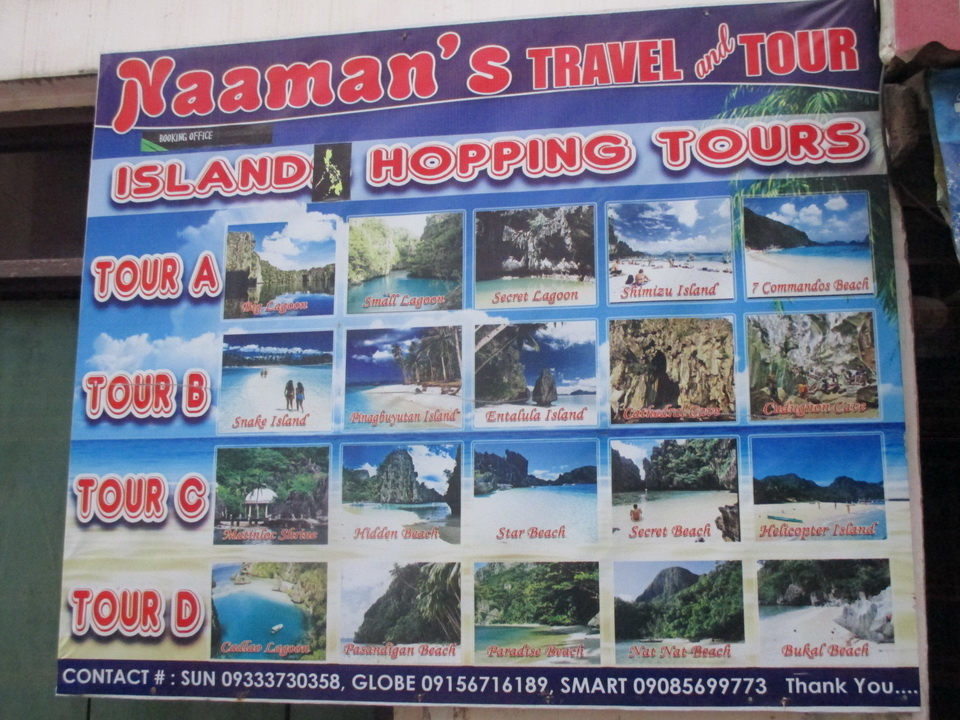 愛妮島的跳島行程就是分為tour A、B、C、D,第1次來的人建議就玩tour A及 C,如沒記錯公定價為1200~1400p,每個行程都會帶至5景點。