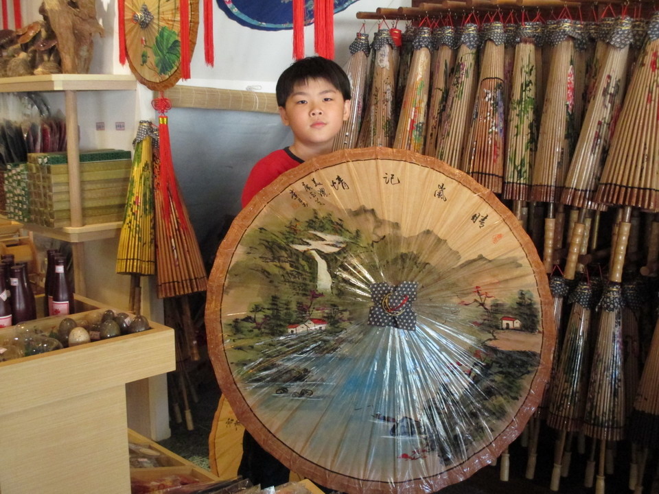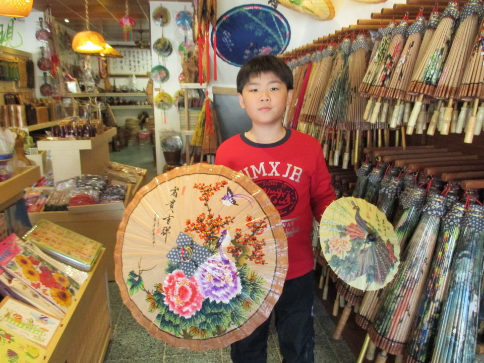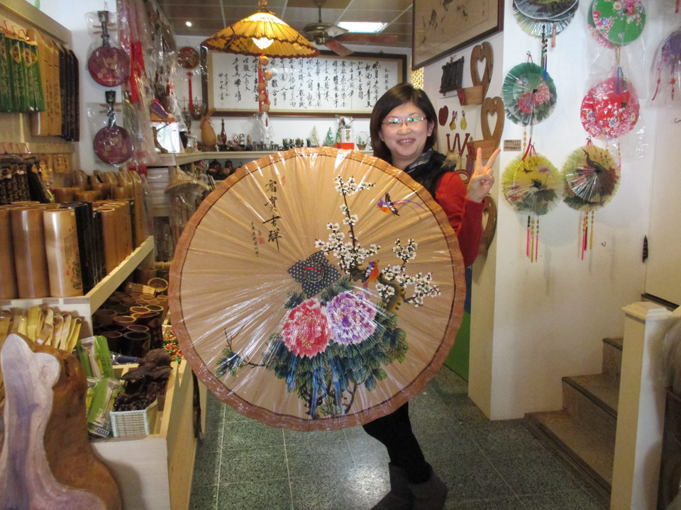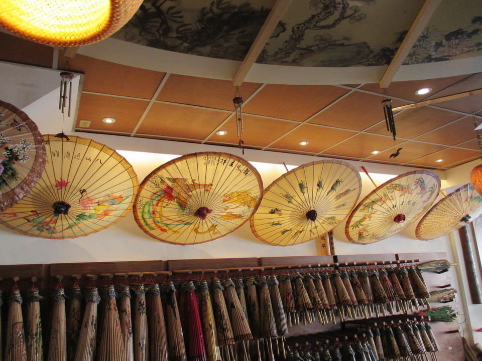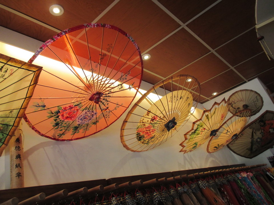 紙傘店內外都放了很多紙傘,傘上大多的圖案都是中國畫風,如花、美女、田園風光等!!