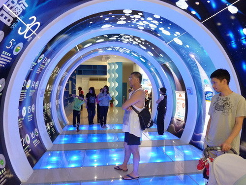 鹽來館中最有科技感的隧道,也是以藍白為主色,介紹鹽的妙用等,如可以