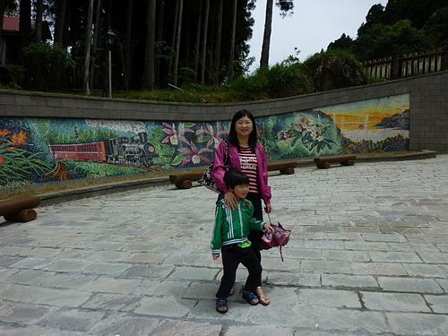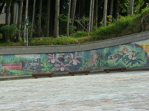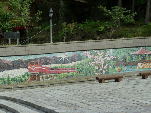 最先映入眼廉的便是阿里山的馬賽克磚,大致將阿里山的特色展現出,如火車,櫻花,日出等!!