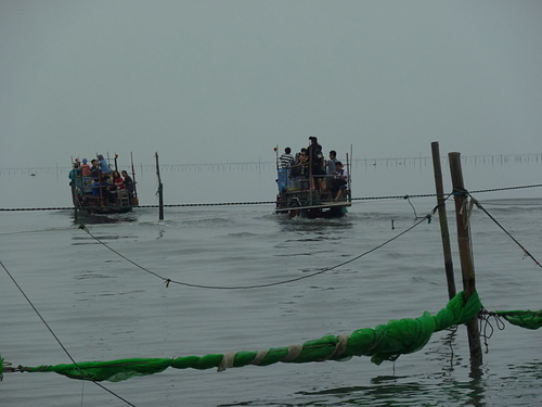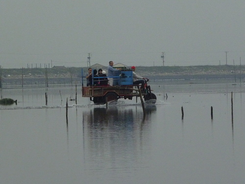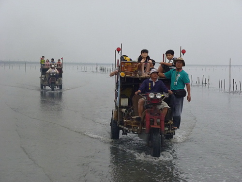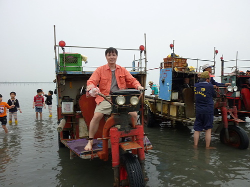 一路上坐在鐵牛車上真是拉風,不久就下海了,大家都蠻興奮的。在海上,一根根的竹