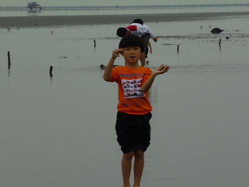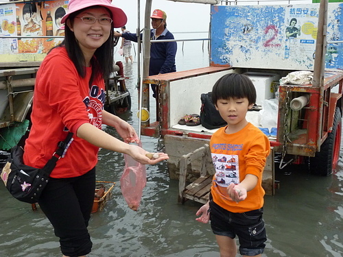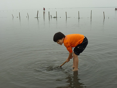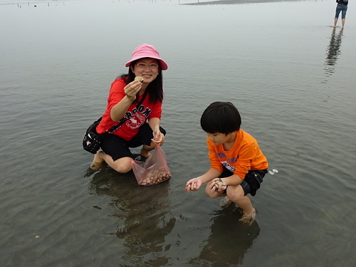 不一會兒,經過jacky一家人的努力,已摸到半包的蛤蜊了,flyer 開心的滿手都是戰利品!!