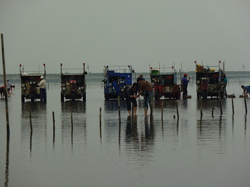 在回歸正途後,約 2:00 時到達了約定的地點,已經看到好幾台鐵牛車(採蚵車)已在等