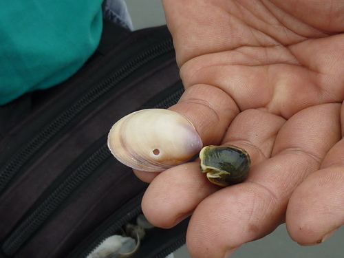導覽大哥秀出了織紋螺,和有一個小洞的蛤蜊殼,告訴我們織紋螺會吸附在蛤蜊上,而溶解