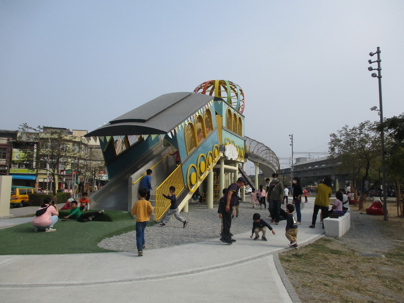 屏東縣政府與交通部台灣鐵路局合作,在林邊火車站前打造林邊共融公園,其中長達30米的「飛天火車」造型遊具特別吸睛,吸引不少大小朋友的目光,縣府表示,場域內遊具皆通過SGS兒童遊戲場安全檢驗合格認證標章,相信啟用後的共融公園,將可提供林邊老中青三代一個安全散步、體健及遊戲的共玩空間。