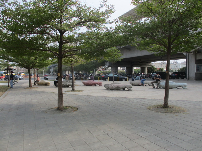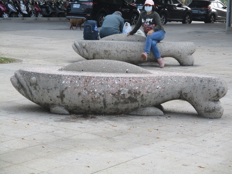 位於公園火車站間的魚型座椅。