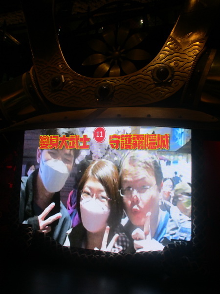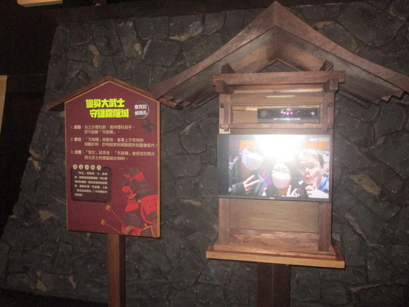 進到內部後,就是"變身大武士,守護霧隱城",你只要站在鏡頭前方,就會拍照,然後將照片投放至城主的頭盔中!!!