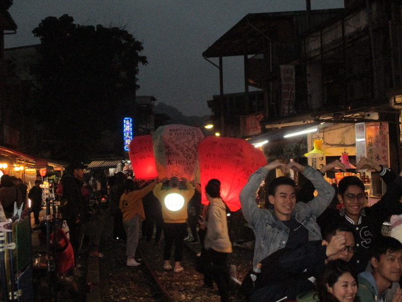 當火車一駛離,遊客立馬又佔據鐵道,開始放天燈祁福。