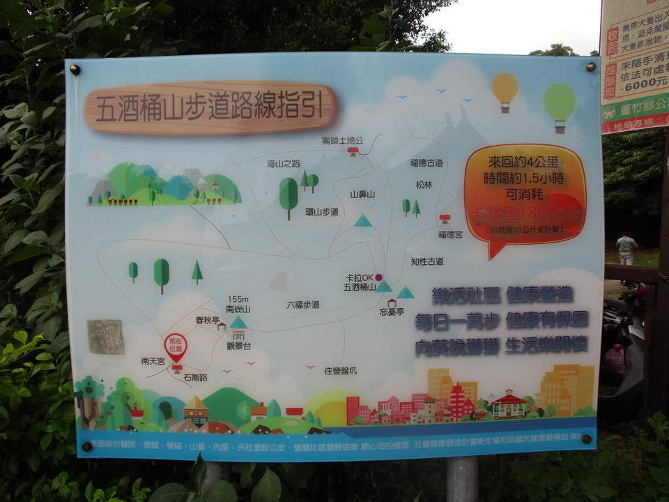 從南天宮至崙頭土地公約2km,來回4km,可消耗186大卡!