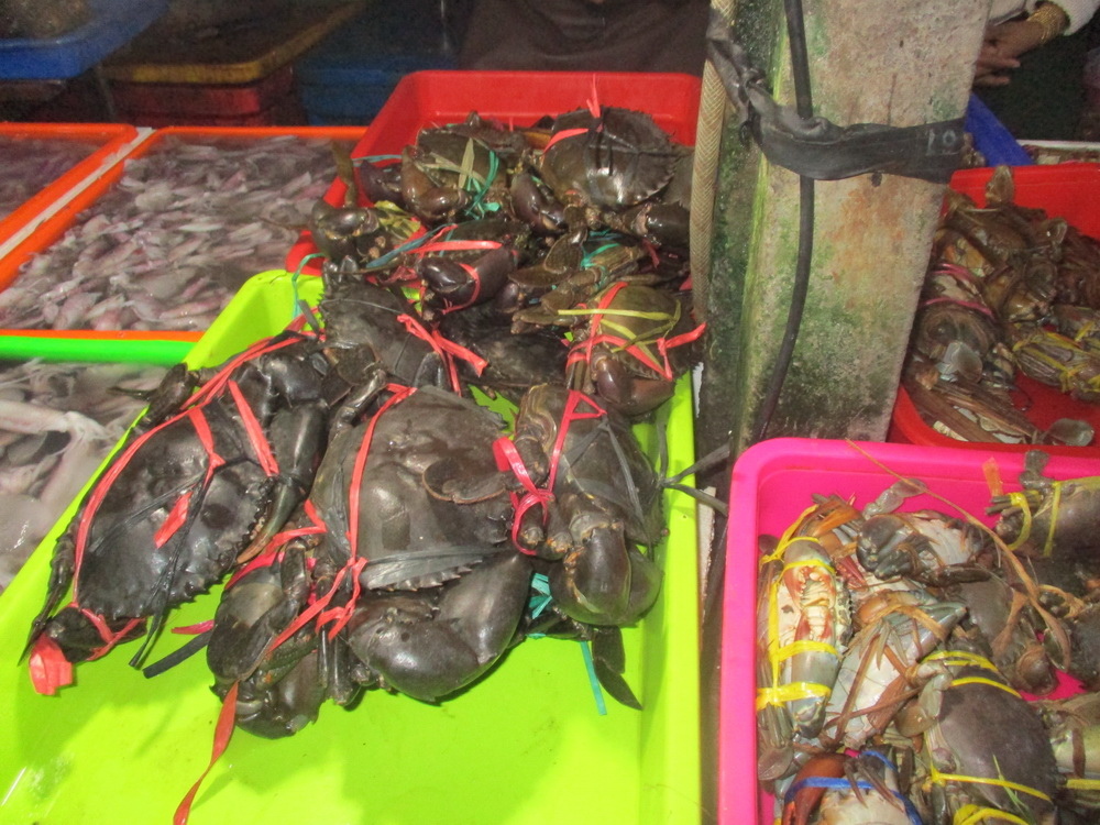 買了左邊的類似沙公是活的,200k/kg,右邊有蛋的較小母蟹價格為320k/kg,所以我就買了2隻活的大沙公,共230krp。