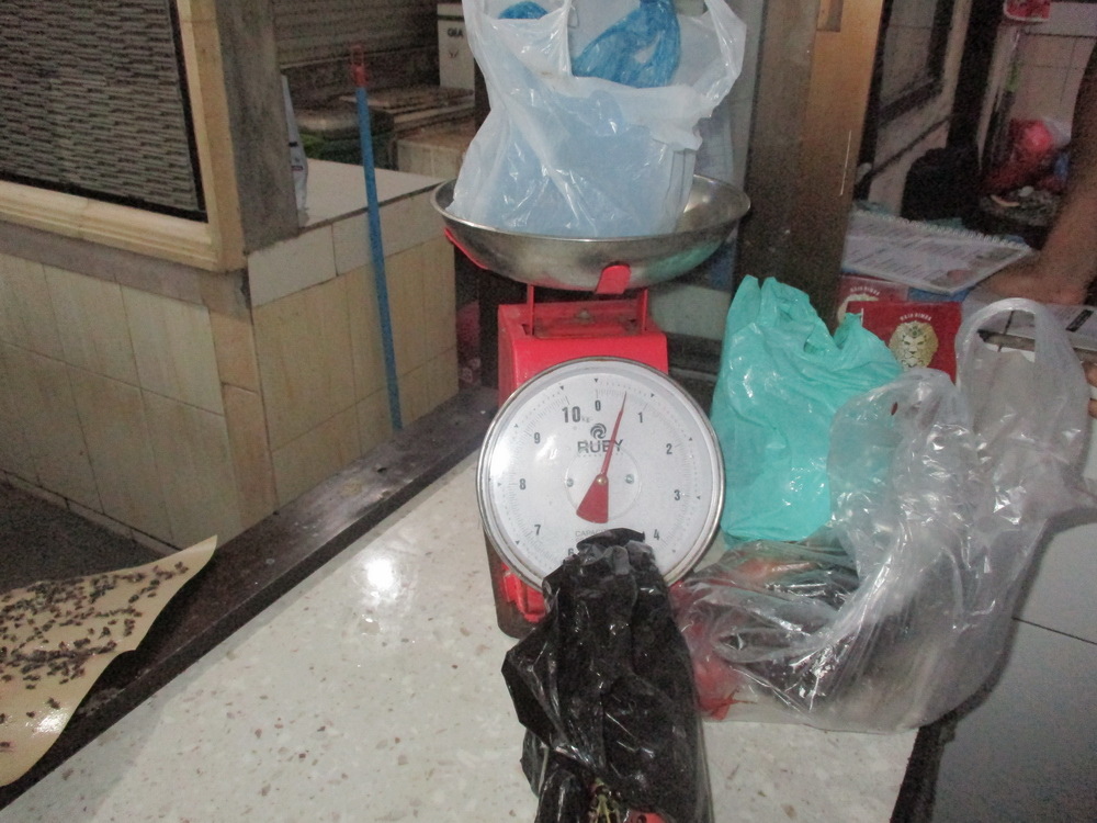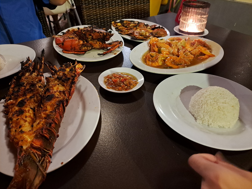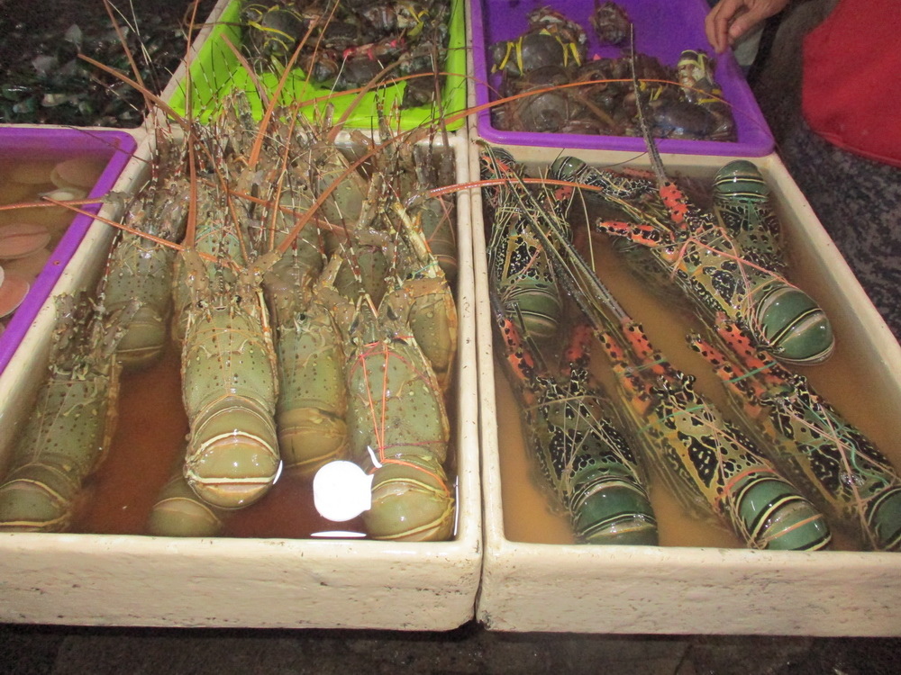 最後則是重頭戲的龍蝦,在看了很多攤後在起駐足,右邊的青龍較貴 420k/kg ,左邊的較便宜為 380k/kg,最後則買了2隻青龍為 760k,每隻約1kg