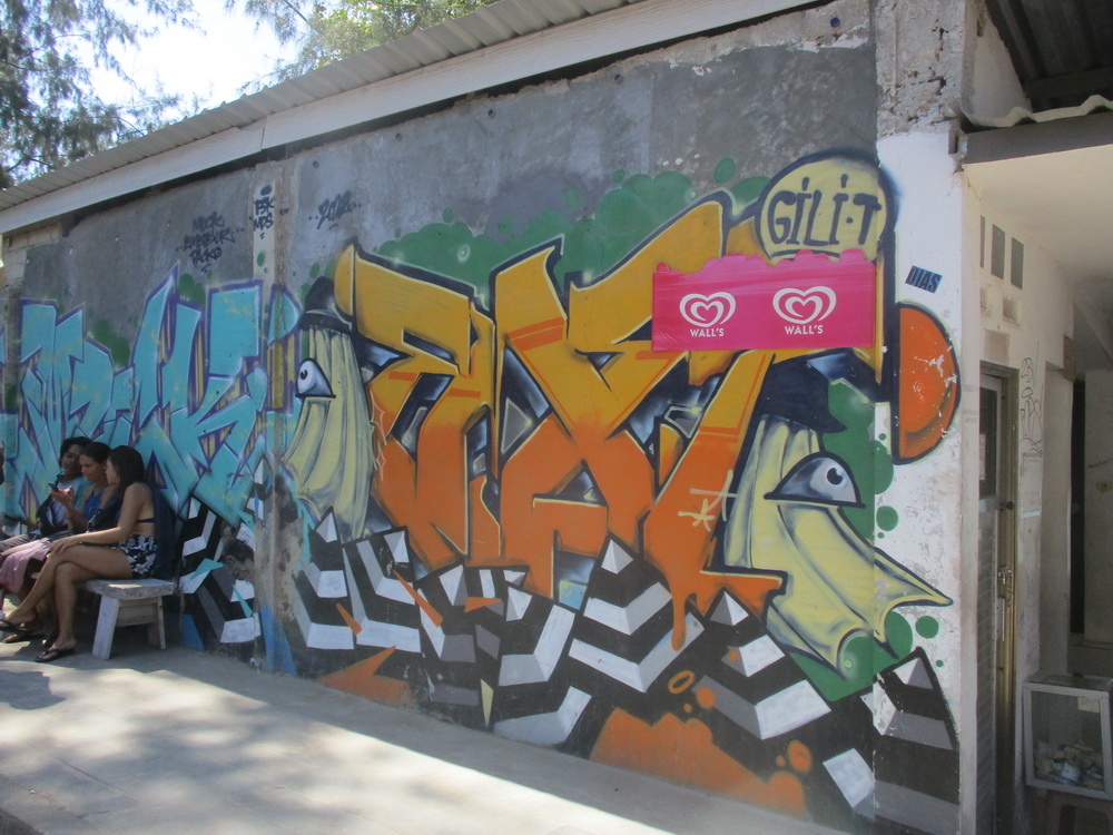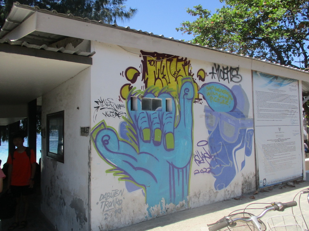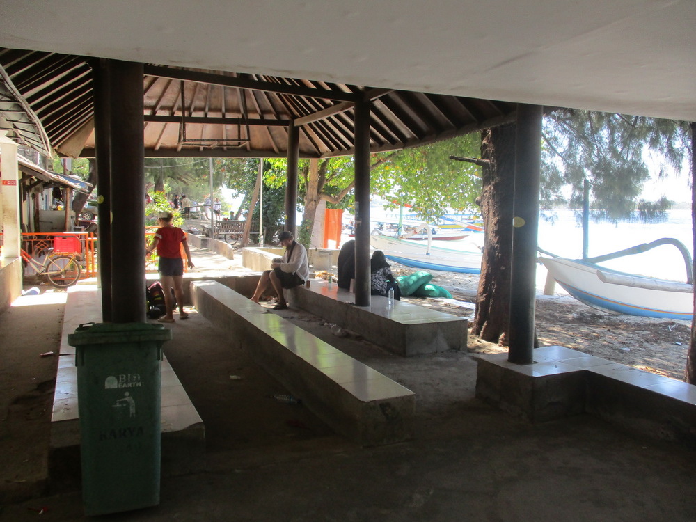 公共船因為是當地的小船,所以並無碼頭,就是直接在沙灘上、下船,位置在 Gili Trawangan Port (峇里島或潘尼達島來的船隻都停靠的碼頭) 北邊約200m 的建物搭乘,建物是由二間平房連接而成,外部都是圖鴉,有點雜亂無章,看不出來是搭公共船的售票處。