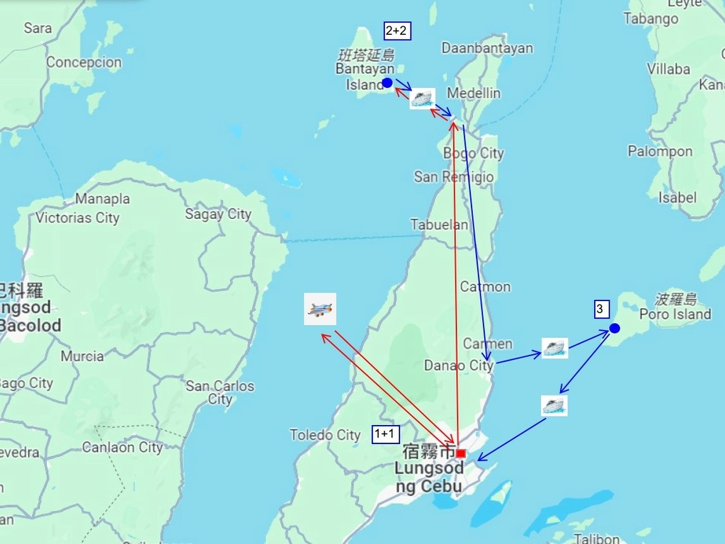 宿霧 => 班塔延島 => 蕃薯島 => 宿霧 。