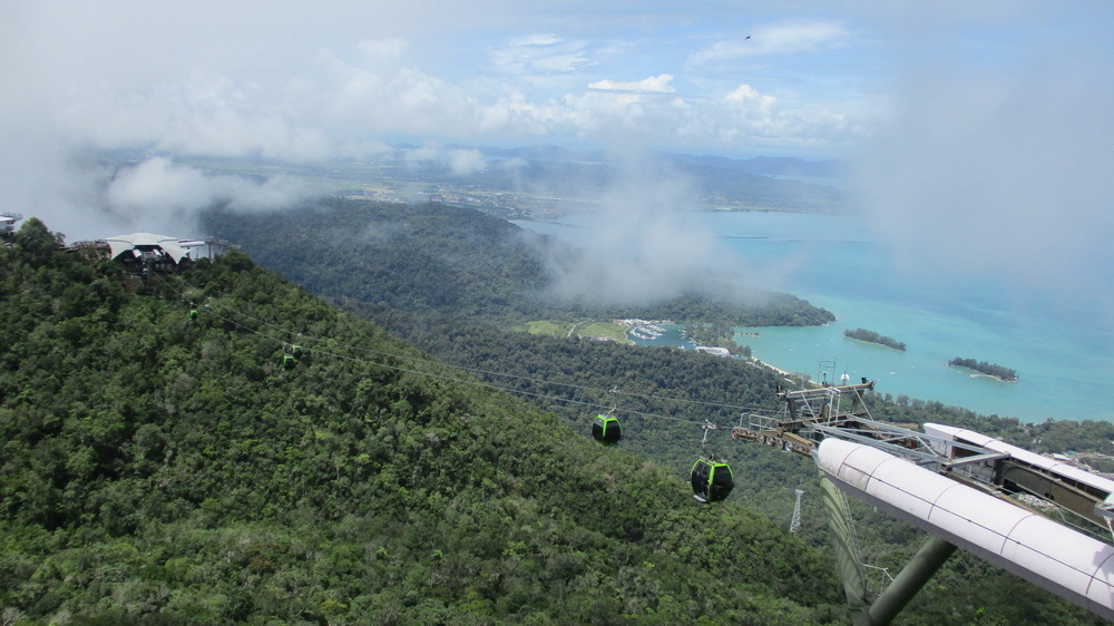 在往天空纜車看去,一輛輛的纜車上上又下下,搭配後方的綠色森林、白色浮雲及藍色的大海,形成了一幅美景。