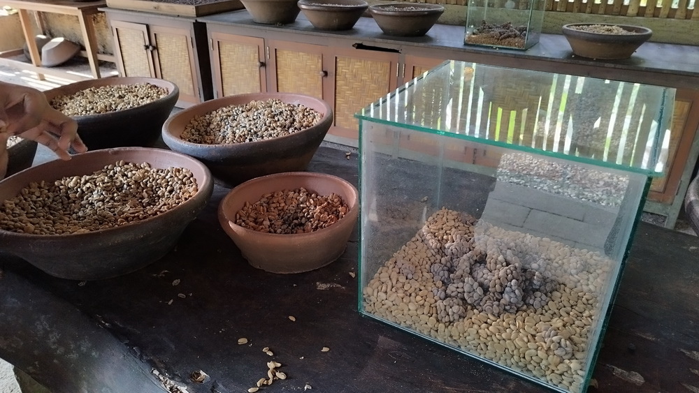 也有生豆的展示,玻璃櫃中一團團的就是麝香貓咖啡豆,經過胃液和腸道的姿養後的形狀。